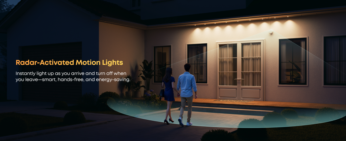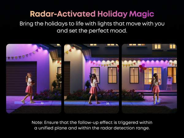 3-in-1 Lighting, Welcome, and Security: With 120°, 12 m radar coverage, this smart light strip offers precise motion detection for automatic lighting effects that follow your movement. Set customizable security alerts with flashing warnings to deter intruders.