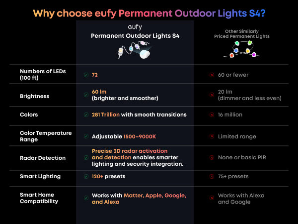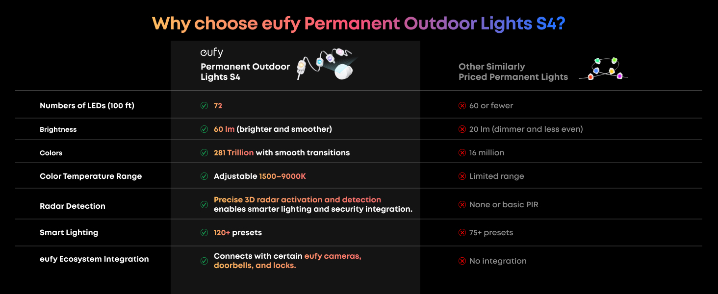 - eufy Permanent Outdoor Lights S4 is not compatible with the eufy Permanent Outdoor Lights E22 extension cable or lights.