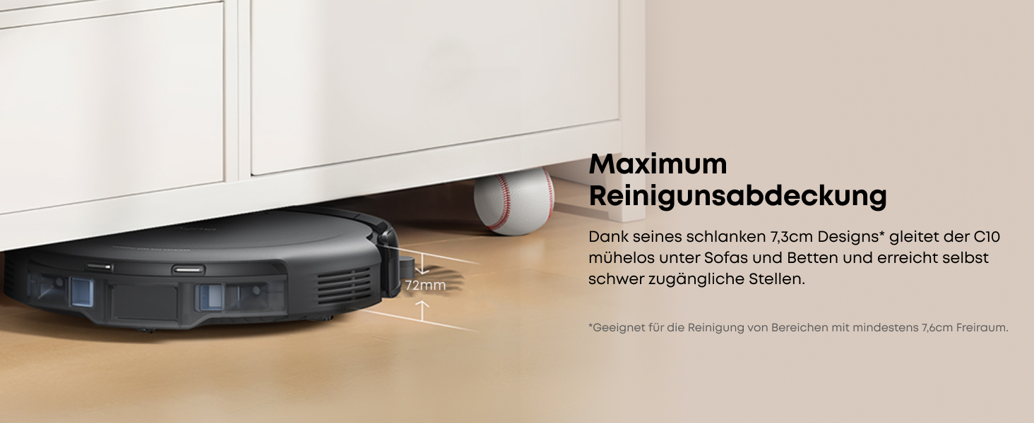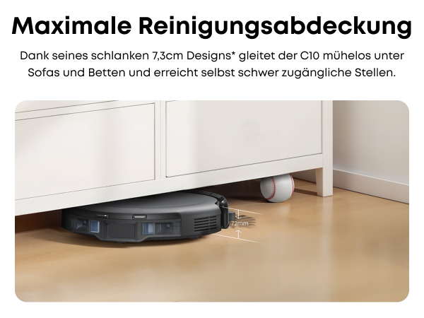 Ultraflaches Design:Mit nur 7,3 cm Höhe gleitet der C10 mühelos unter Betten, Schränke und andere Möbel. So erreicht er selbst schwer zugängliche Bereiche und reduziert den Aufwand für manuelle Reinigung.