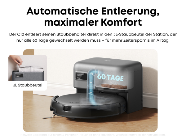 Automatische Absaugstation:Der C10 entleert seinen Staubbehälter vollautomatisch in den großzügigen 3-Liter-Staubbeutel der Station, der nur alle 60 Tage gewechselt werden muss.