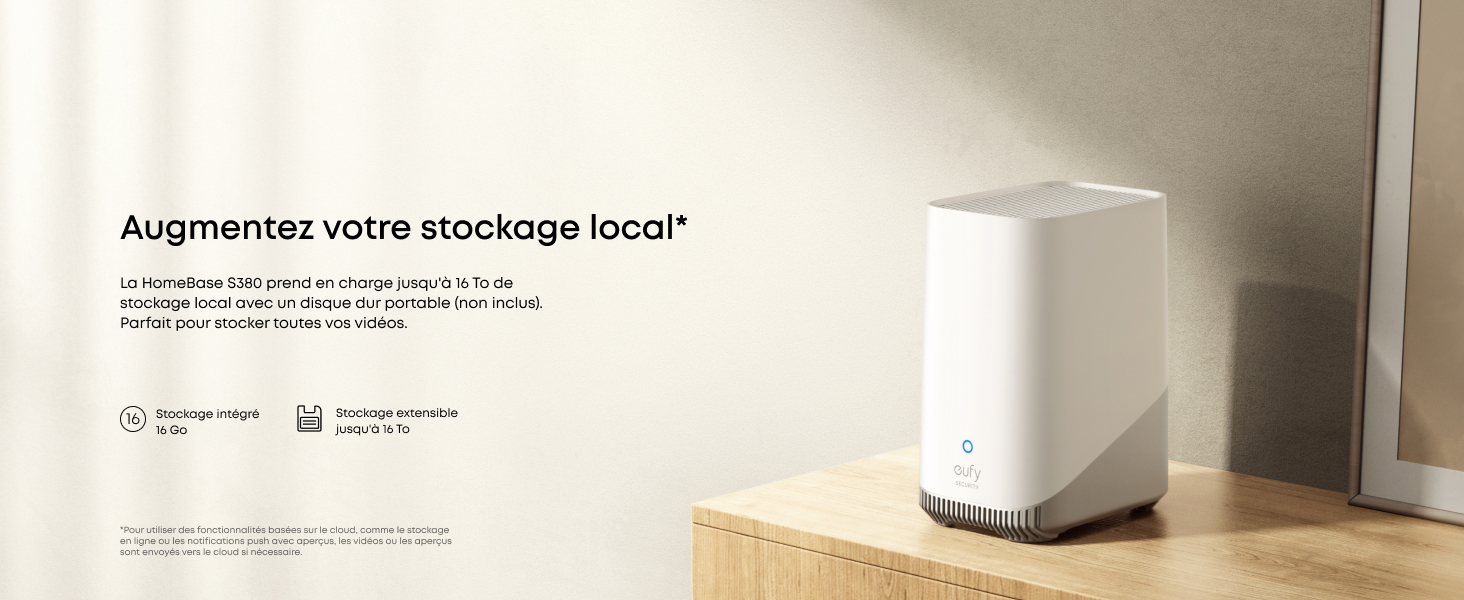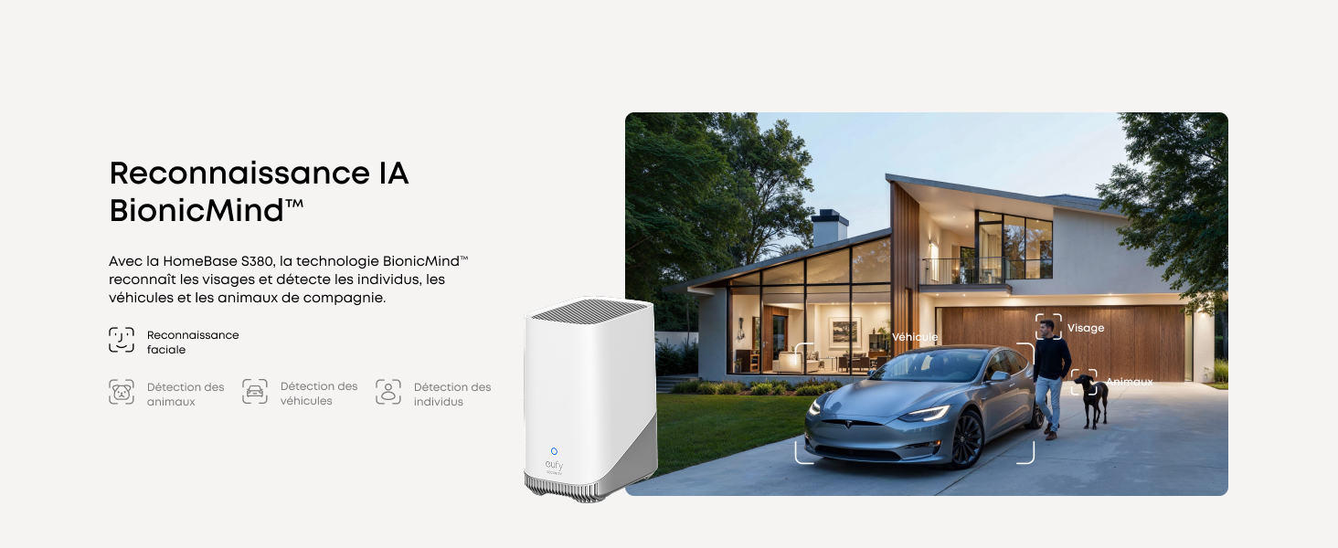 Encore mieux avec la HomeBase S380 : Profitez de fonctionnalités améliorées avec la station HomeBase S380, comme l'IA BionicMind, qui différencie les membres de la famille des inconnus. La station possède 16 Go de stockage intégré, extensible jusqu'à 16 To, pour que toutes vos vidéos soient stockées sans le moindre souci.