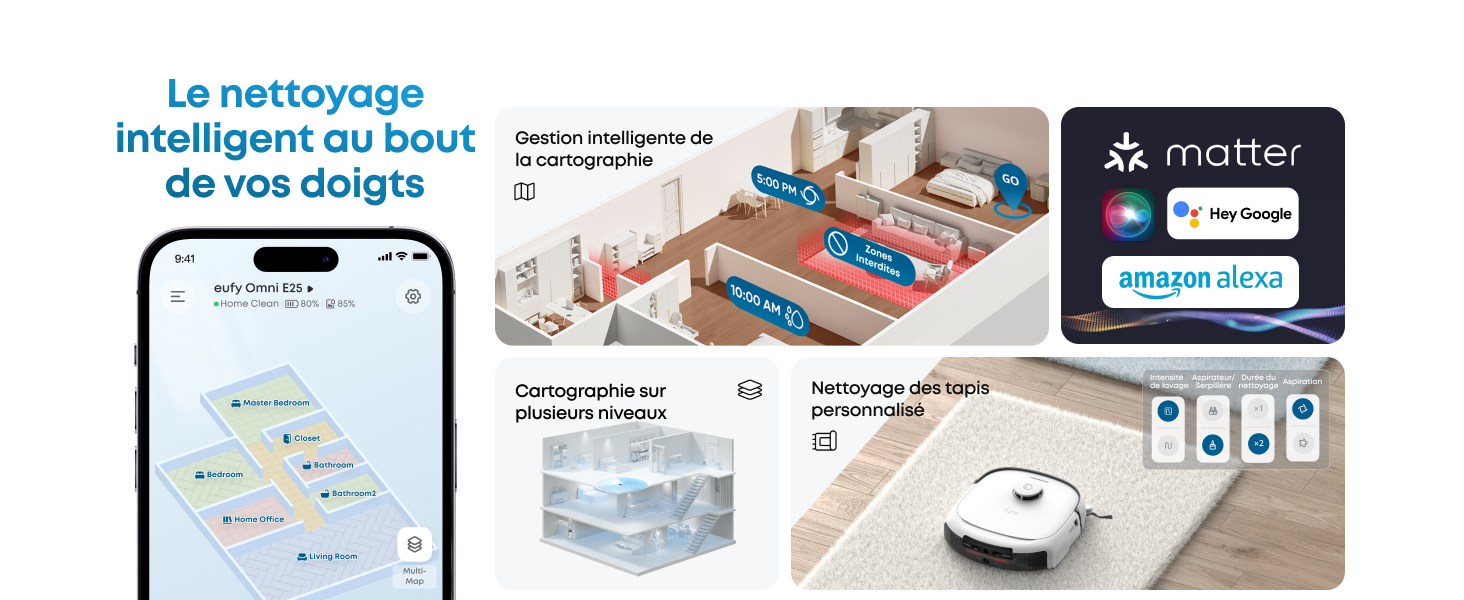 Aspiration turbo 20 000 Pa :Le robot E25 effectue un nettoyage en profondeur de qualité professionnelle, aussi bien sur les tapis que sur les sols. Il retire efficacement la poussière et les poils incrustés, pour que votre foyer brille comme un sou neuf.