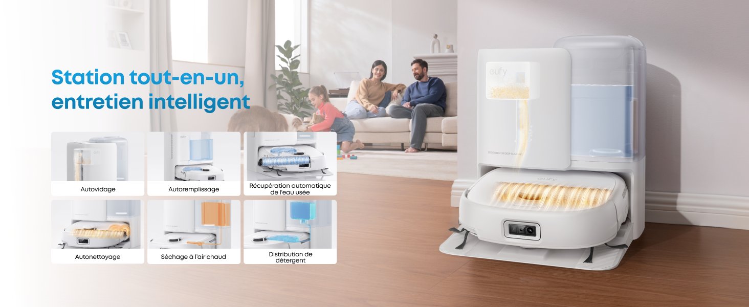 Station tout-en-un :Une expérience véritablement mains libres grâce au vidage, au nettoyage et au remplissage automatique, ainsi qu’au séchage performant et à la récupération des eaux usées.