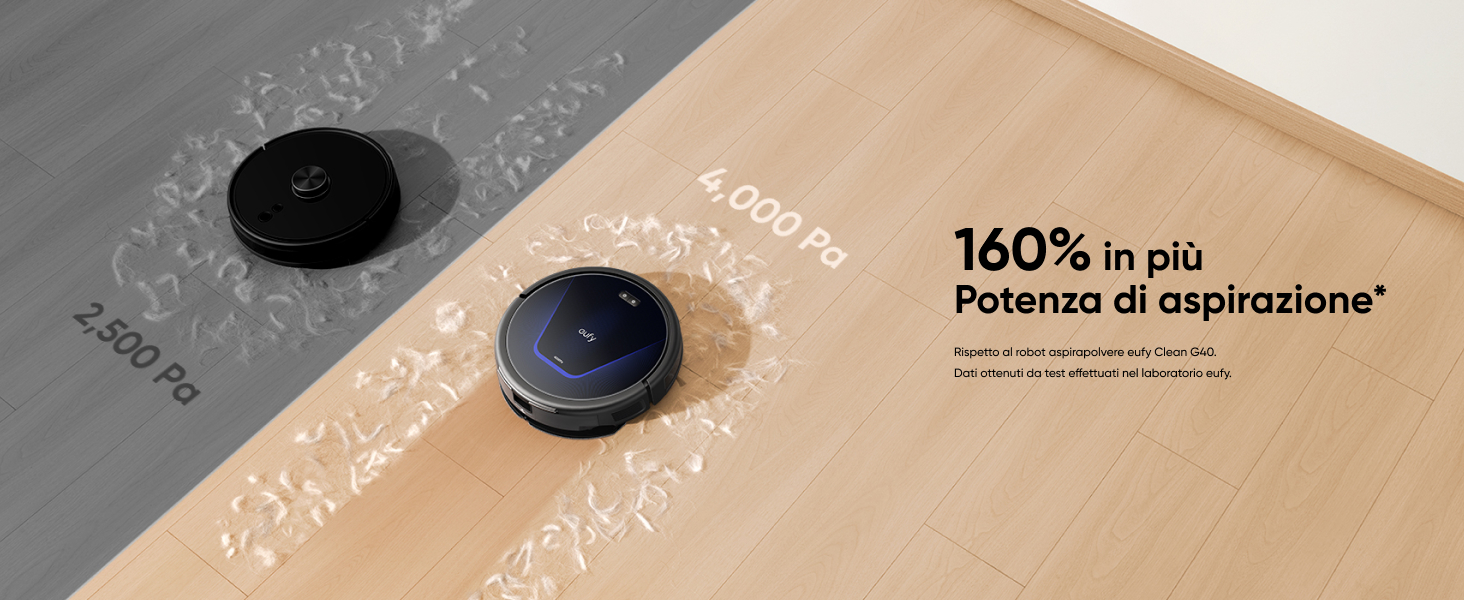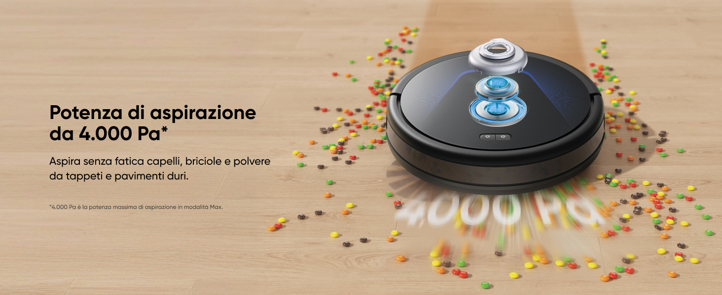 • 4.000Pa POWERFUL VACUUM: rimuove facilmente peli di animali domestici, briciole e polvere dai pavimenti grazie a un'aspirazione potente fino a 4.000Pa e a un capiente contenitore della polvere da 600ml che consente di evitare frequenti svuotamenti.