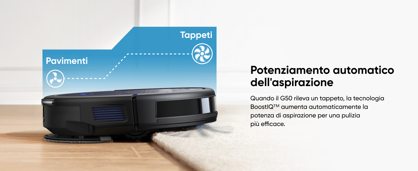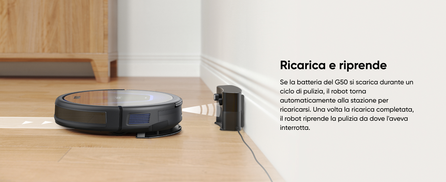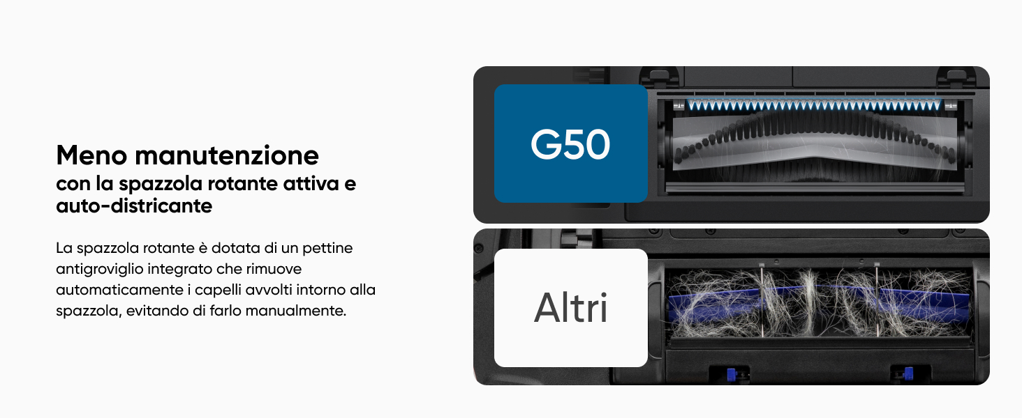 • SPAZZOLA AUTOPULENTE: non è più necessario estrarre manualmente i capelli dalla spazzola: l'innovativo pettine districante del robot aspirapolvere G50 scioglie automaticamente i grovigli e garantisce una spazzola pulita dopo ogni pulizia.