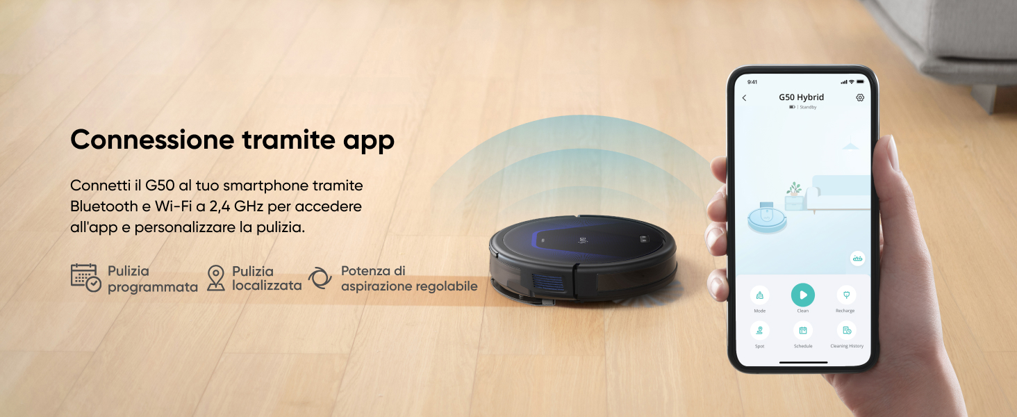 • IMPOSTAZIONE FACILE: Collegate il robot aspirapolvere G50 al vostro telefono cellulare tramite Bluetooth e programmate gli orari di pulizia o avviate la pulizia a campione direttamente tramite l'app eufy.