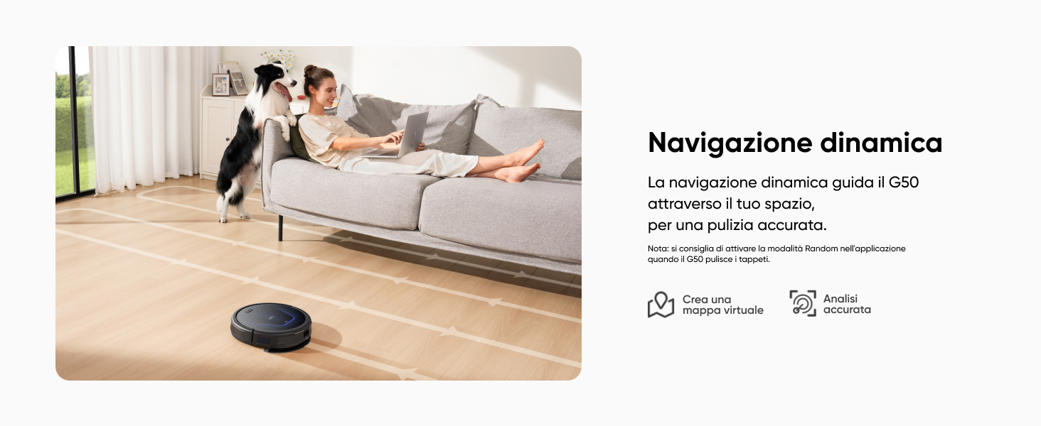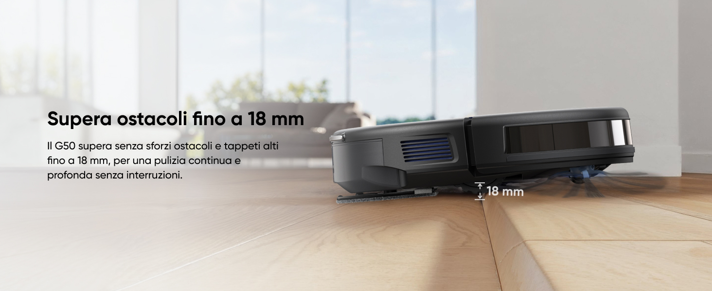 • NAVIGAZIONE DINAMICA: G50 naviga sistematicamente attraverso le stanze. Grazie alla sua altezza ridotta di 81 mm, il robot aspirapolvere può passare facilmente sotto i divani o gli armadi.