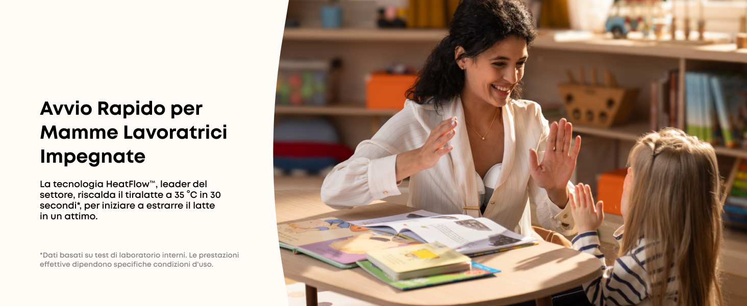 Avvio Rapido per Mamme Lavoratrici Impegnate: Inizia a estrarre il latte in 30 secondi. La tecnologia HeatFlow™, leader del settore, riscalda rapidamente il tiralatte fino a 35 ℃ e aumenta il flusso di latte.