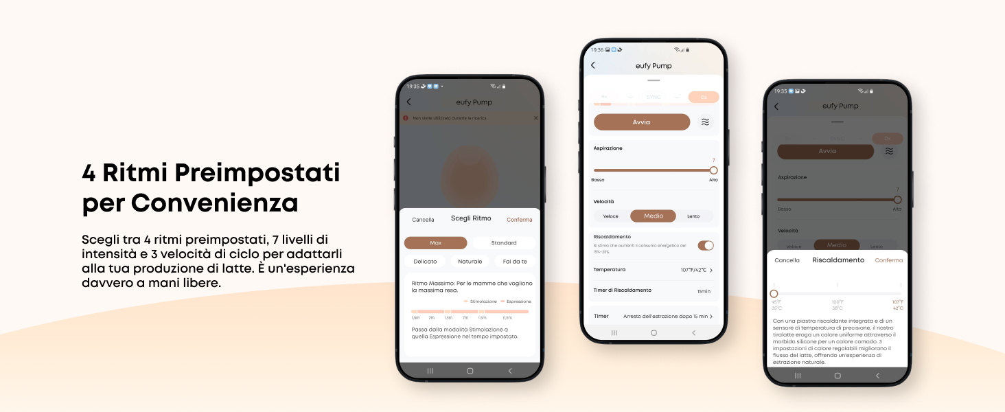 Estrazione Intelligente e a Mani Libere: Nell'app eufy, scegli tra 4 ritmi preimpostati e 3 livelli di calore e personalizza la routine di estrazione. Controlla il tiralatte da remoto per un'esperienza discreta e comoda.
