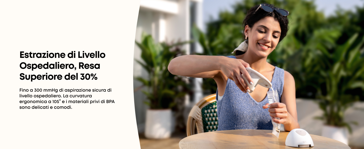Aspirazione da Ospedale per la Resa Ulteriore di 30%: Massima resa di latte con aspirazione sicura a 300 mmHg. La curvatura ergonomica di 105° garantisce un abbraccio delicato, tutte le parti a contatto con la pelle sono di materiali alimentari senza BPA.