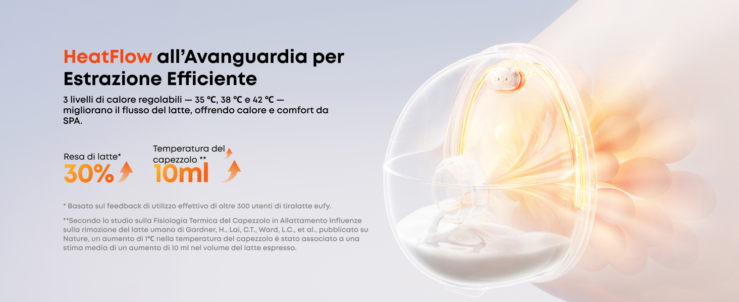 Tiralatte Indossabile Riscaldato: La rivoluzionaria HeatFlow™ offre una resa superiore del 30%*. Goditi un'estrazione calda, rilassante e più efficace.