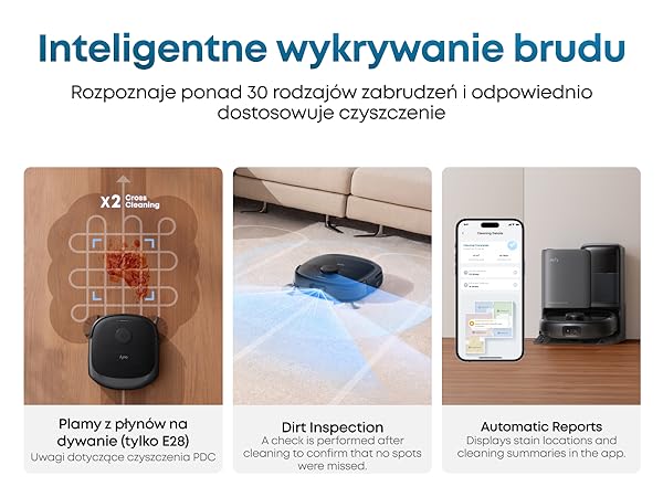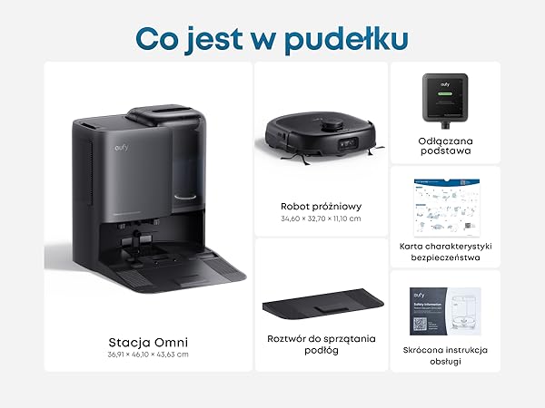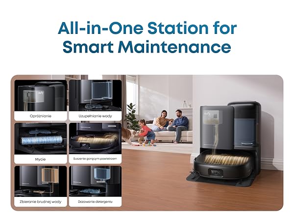 Stacja wszystko w jednym: Dzięki samoczynnemu opróżnianiu, myciu, suszeniu gorącym powietrzem, dozowaniu detergentu, zbieraniu wody po myciu i napełnianiu możesz cieszyć się wygodnym sprzątaniem.