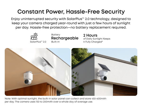 - Always-On Security with SolarPlus 2.0 Technology: Just 2 hours of direct sunlight daily keeps your camera fully charged for continuous, maintenance-free operation in any weather.