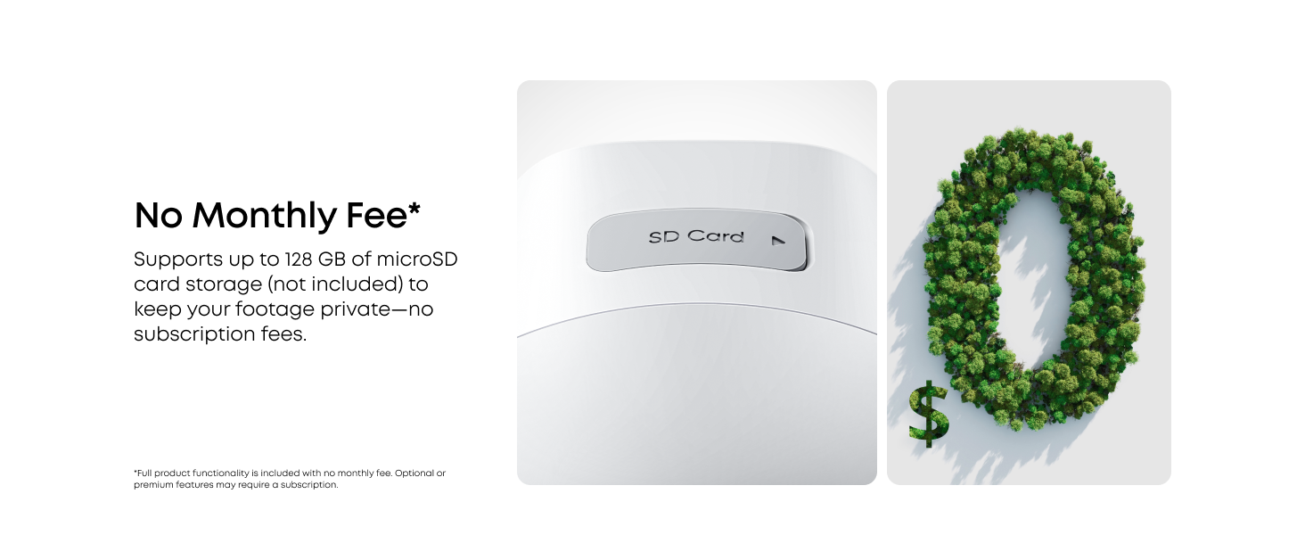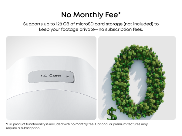 - No Monthly Fee: Supports up to 128 GB of microSD storage to keep your footage private—no subscription fees. Note: microSD card not included.