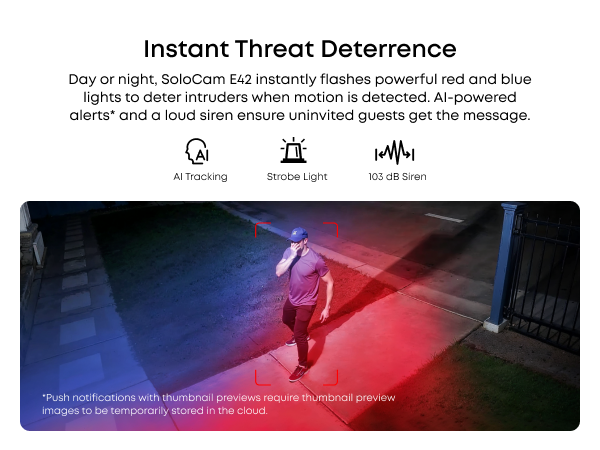 When an intruder is detected, SoloCam E42 will activate red and blue strobe lights and a siren. The user will also receive a notification on their phone.
