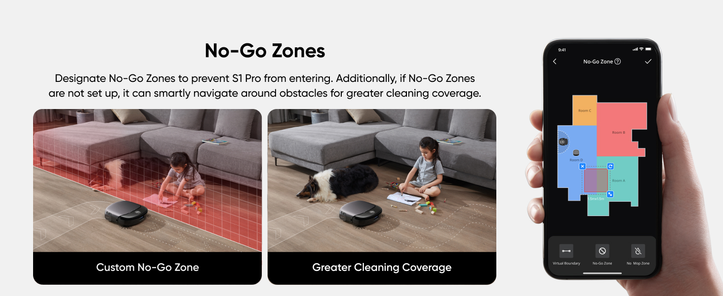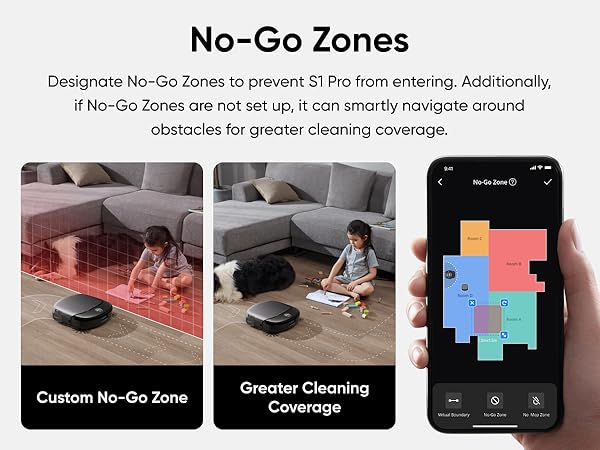 - No-Mop Zones: Designate no-mop zones in areas where the mop might not lift in time, ensuring your carpets remain dry. By following these guidelines, you can optimize S1 Pro’s mopping performance and maintain the cleanliness of both your hard floors and carpeted areas without manual intervention.