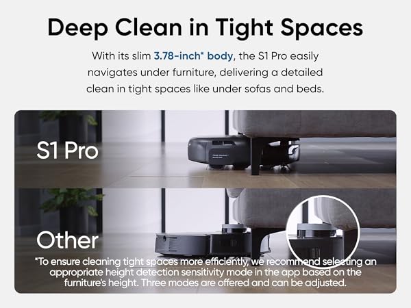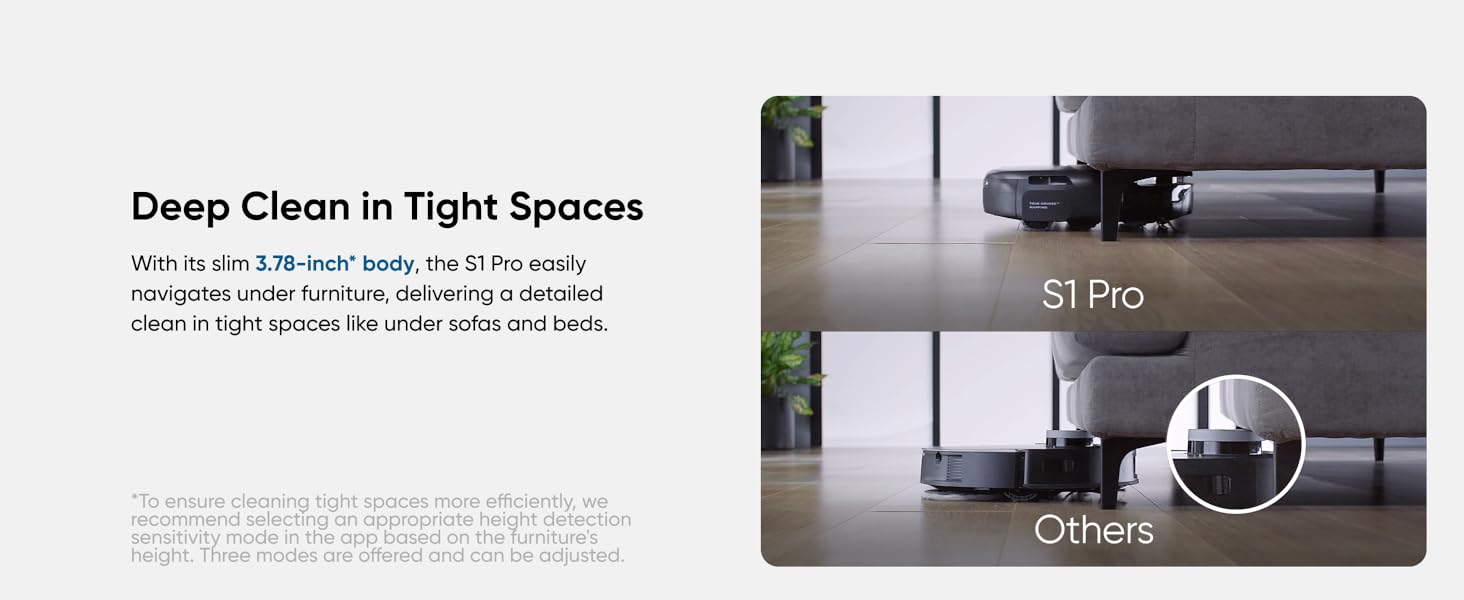 Disabling 'Tiny Obstacle Avoidance' allows S1 Pro to pick up smaller debris without avoiding them. However, note that with this feature turned off, the robot will only pass under furniture if the clearance height is over 10.2 cm. Be aware that deactivating this feature could cause the vacuum to interact with and potentially collect very small objects, which may increase the risk of blockages or damage. Therefore, it is recommended to use this setting cautiously and to monitor the vacuum’s performance to ensure it meets your cleaning needs.