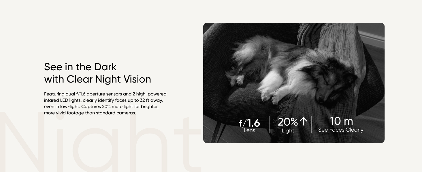 - Exceptional Night Vision: With an f/1.6 aperture sensor and 2 adaptive infrared lights, faces can be seen clearly up to 32 ft away, even in low-light conditions.