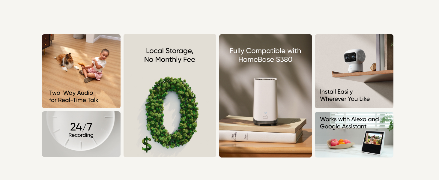 - Intelligent Tracking: Powered by eufy Security's self-developed algorithm, the AI-powered tracking enable the camera to follow family members or pets around the room.