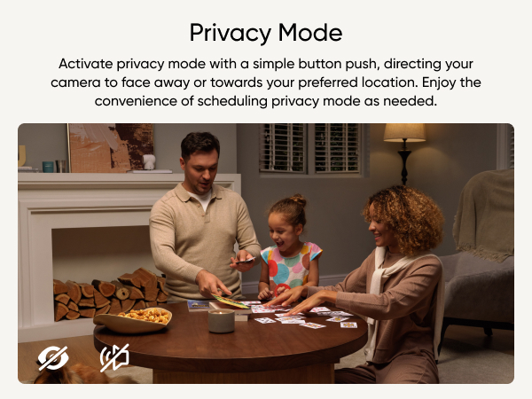 When Privacy Mode is enabled, your camera will look away to face a wall or wherever you set it to, then turn off and stop recording.