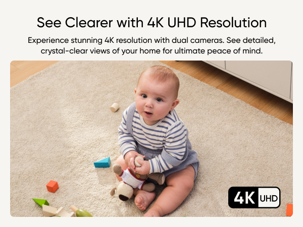 - Superior Clarity: With dual cameras and 4K UHD resolution, this indoor camera delivers clear and detailed views of your home. Whatever you use it to monitor, you'll see it with incredible clarity.