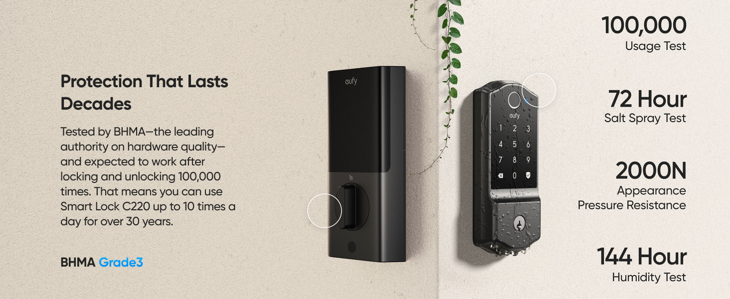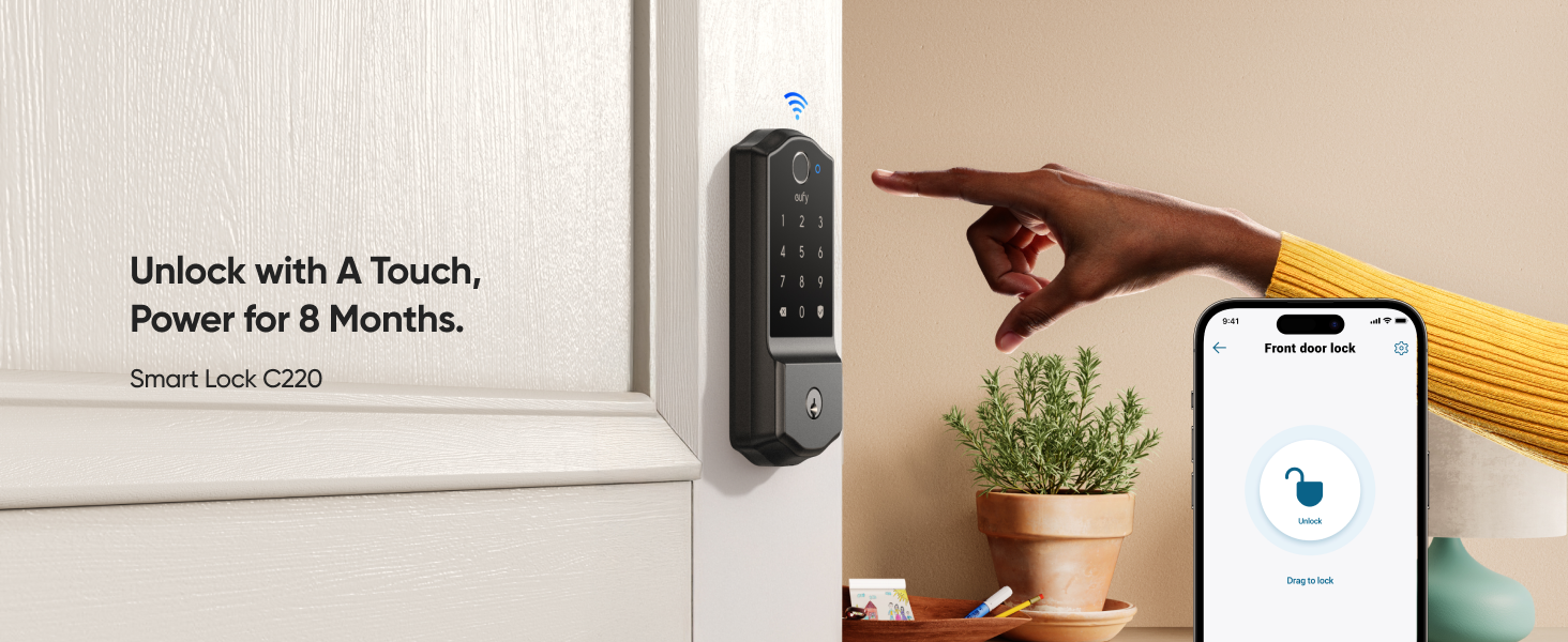 8 Months Battery Life: With 8 AA batteries, Smart Lock C220 runs around 8 months. Experience ultimate convenience and peace of mind with our long-lasting power solution. *May vary depending on the frequency of the lock being used.
