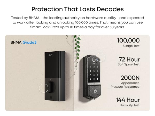 Security and Durability: BHMA Grade 3 Certified after being locked and unlocked more than 100,000 times. Send an alarm triggered by an unusual attempt to open your smart deadbolt lock. Operating temperatures range from -22℉ to 158℉ (-30℃ to 70℃). IP53 Waterproof.