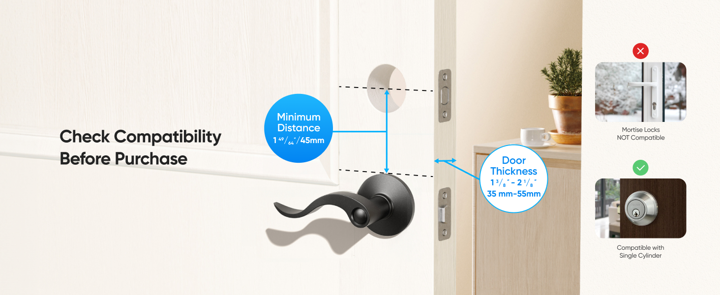 Please check the Compatibility infographic above for specific requirement. Dimensions required: Crossbore center to the top of handleset greater than 45 mm; Door thickness: 35 mm-55 mm. NOT Compatible with Mortise Lock.