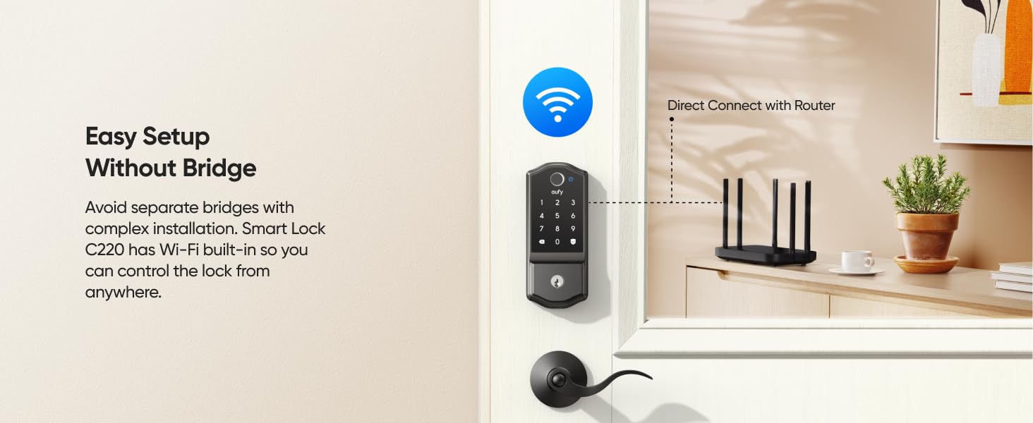 Control from Anywhere with Built-in Wi-Fi: No bridge required, you can control your wifi smart lock from anywhere via the eufy Security app. Easy setup. (Access management, Real-time notification, Event History)【Integrated eufy ecosystem】If you have a eufy doorbell, you can add your wifi door lock to your routines and control devices together for keyless entry within the eufy Security app.