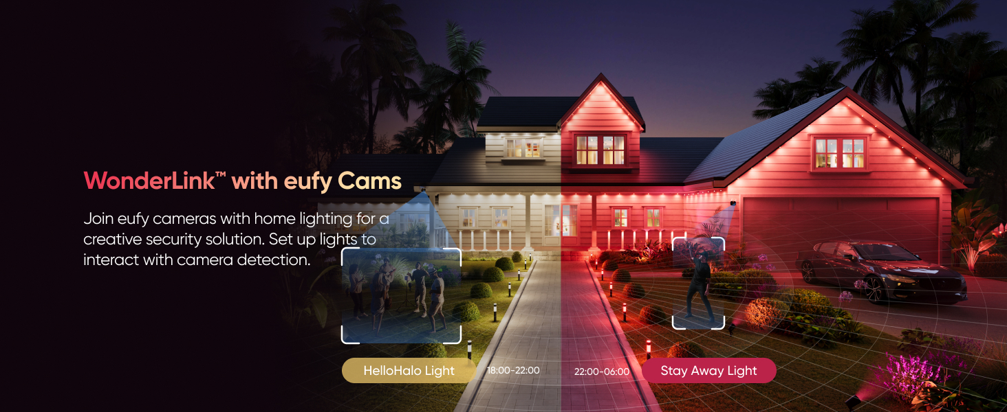 WonderLink is eufy's exclusive technology that connects your outdoor lights with eufy cameras. When humans are detected, the lights are triggered to emit welcoming, warning, or customized light themes, enhancing your home security.