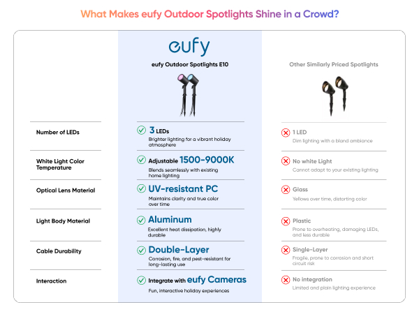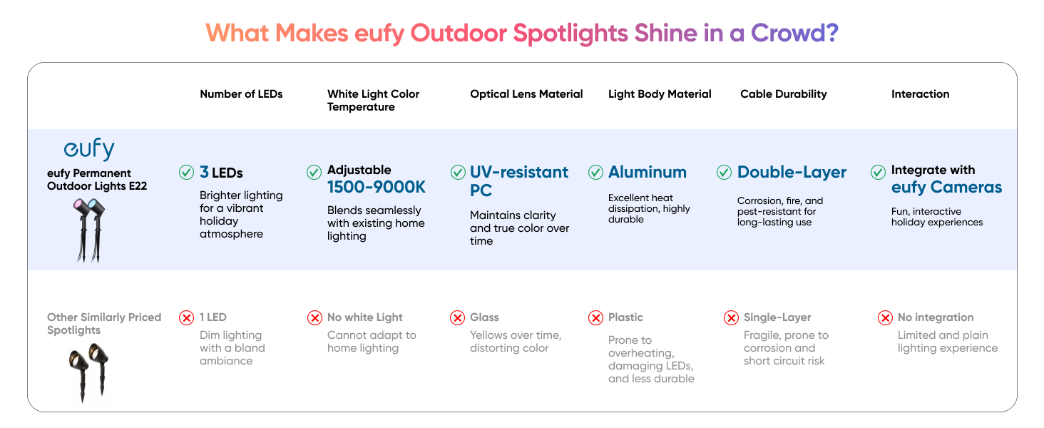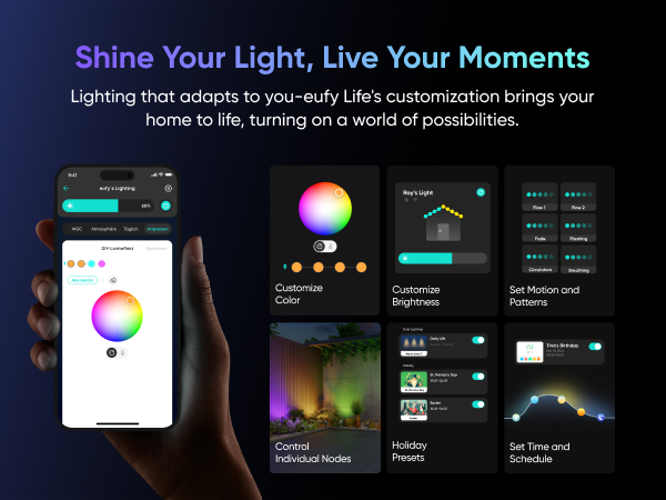 - Seamless Integration with eufy Cameras: Sync the spotlights with eufy cameras to trigger welcoming, warning, or personalized light themes when motion is detected, enhancing safety and community warmth.