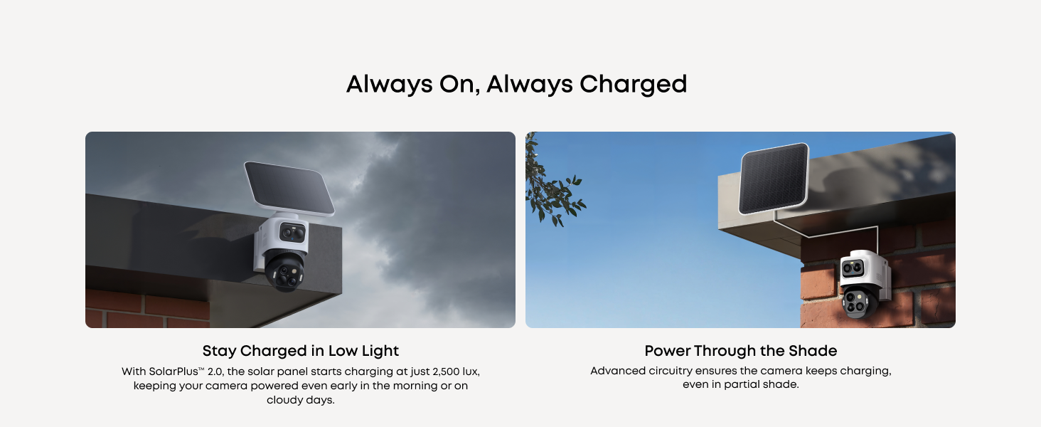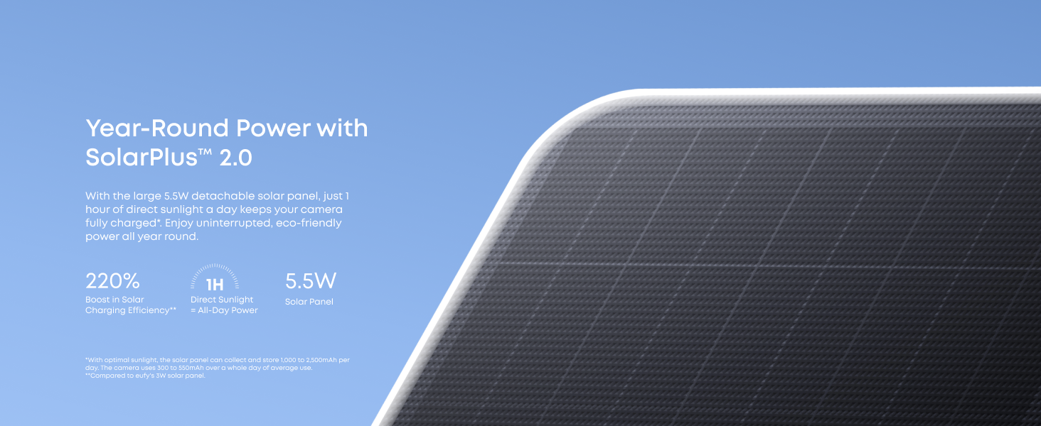Year-Round Power with SolarPlus™ 2.0: Stay charged in any weather with a 5.5W ultra-large solar panel and SolarPlus™ 2.0. Just 1 hour of direct sunlight a day keeps the camera running, even on a cloudy day, and the detachable design makes setup easy and flexible.