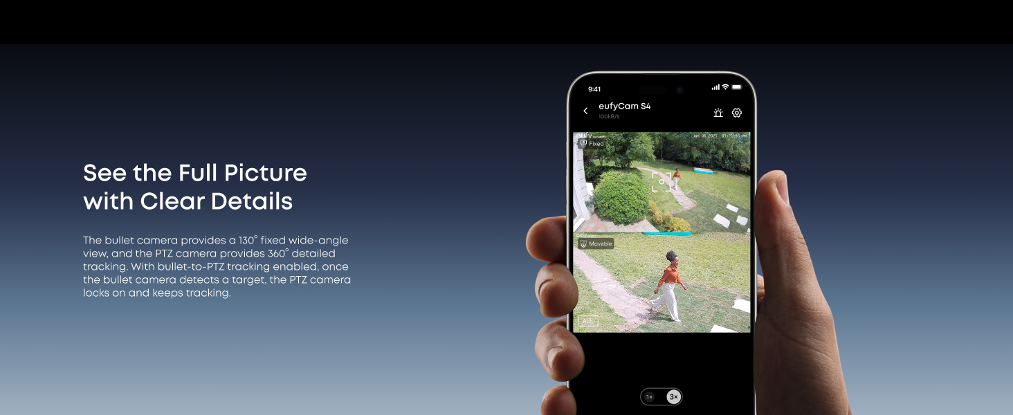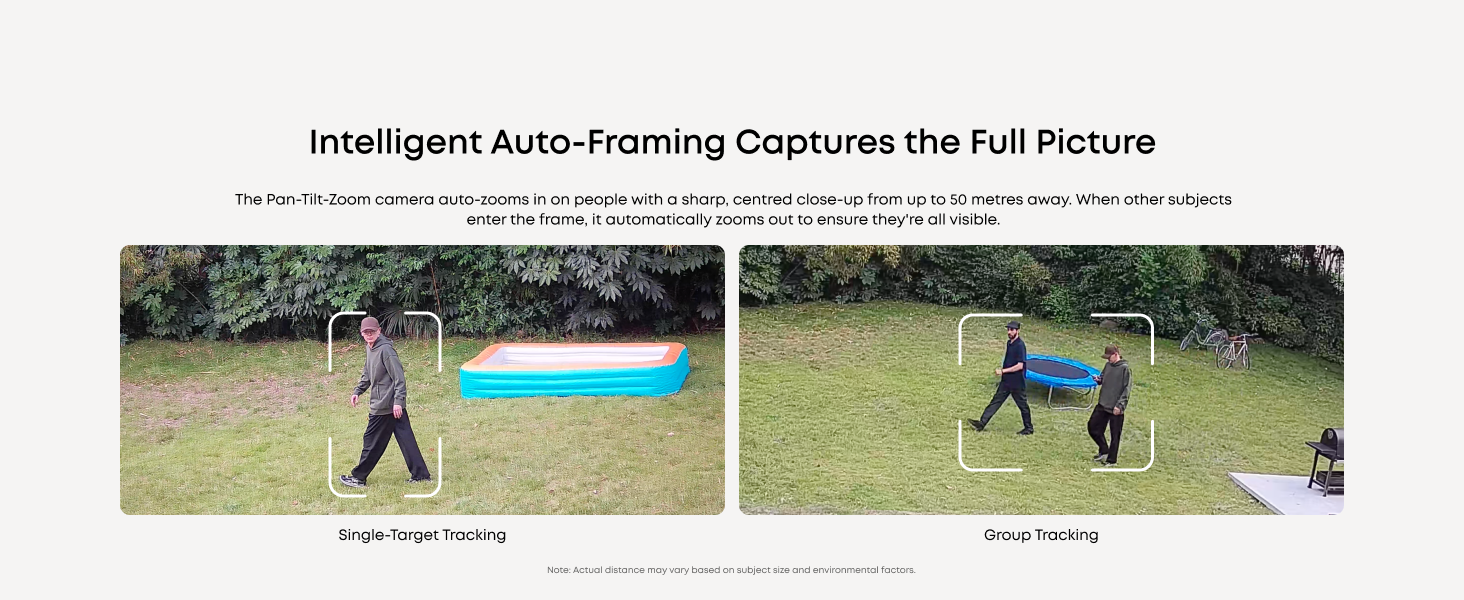 Bullet-to-PTZ Tracking and Auto-Framing:When the bullet camera detects a person, the Pan-Tilt-Zoom camera locks on and auto-tracks them with a sharp, centred close-up from up to 50 metres. When other subjects enter the frame, it automatically zooms out to ensure they're all visible.