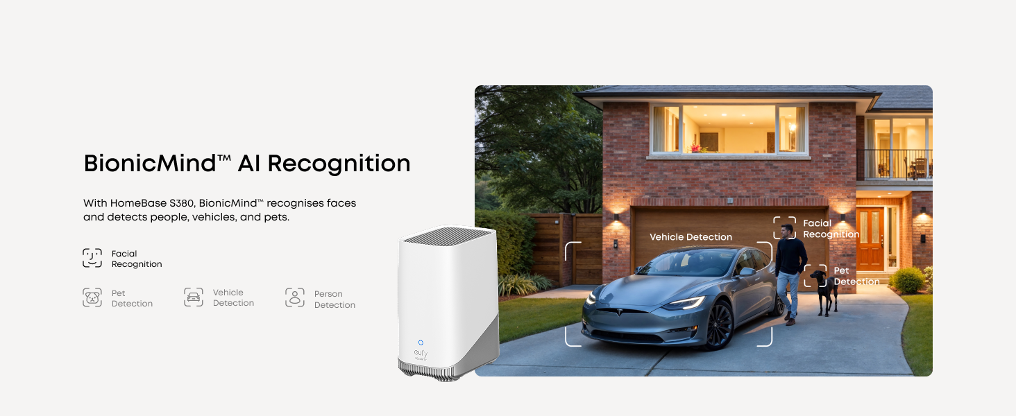 Better with HomeBase S380: Unlock BionicMind™ AI to instantly differentiate family from strangers. With 16GB of built-in storage that's expandable up to 16TB, rest easy knowing you can securely store hours of footage. Before setup, update your HomeBase S380 to version V3.7.2.8 or later and use the latest eufy app version; otherwise, eufyCam S4 won’t support 24/7 recording or Snapshot.