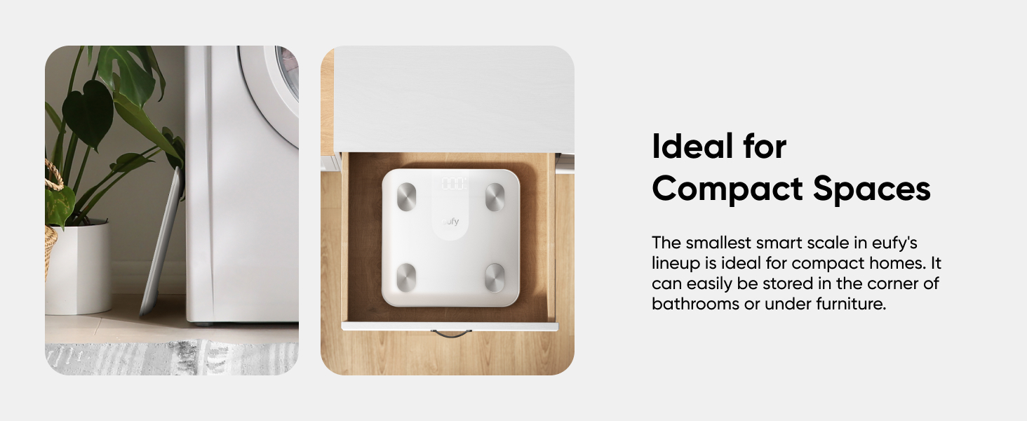 Compact Design: eufy A1 Smart Scale measures just 26 × 26 × 2.5 cm, making it ideal for small spaces. It can easily be stored underneath furniture for further convenience.