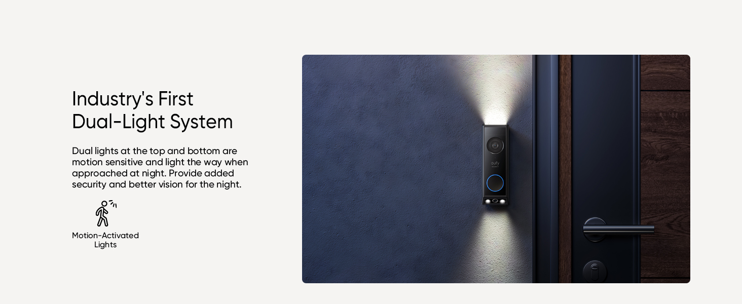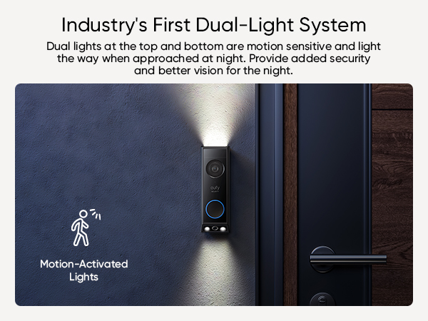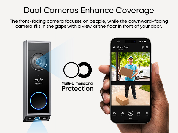 - Dual Cameras, Double Security: Two cameras work together to deliver advanced viewing. The front-facing camera focuses on people, while the downward-facing camera fills in the gaps with a view of the floor in front of your door.
