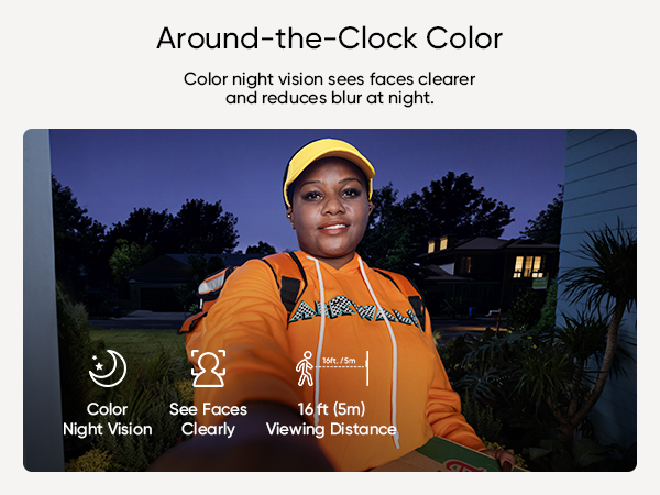 - Color Night Vision for a Clear View : Introducing the industry's first dual-light system paired with an advanced light capturing and processing algorithm. Less blur than previous iterations of night vision and a clear nighttime viewing distance of up to 16ft (5m).